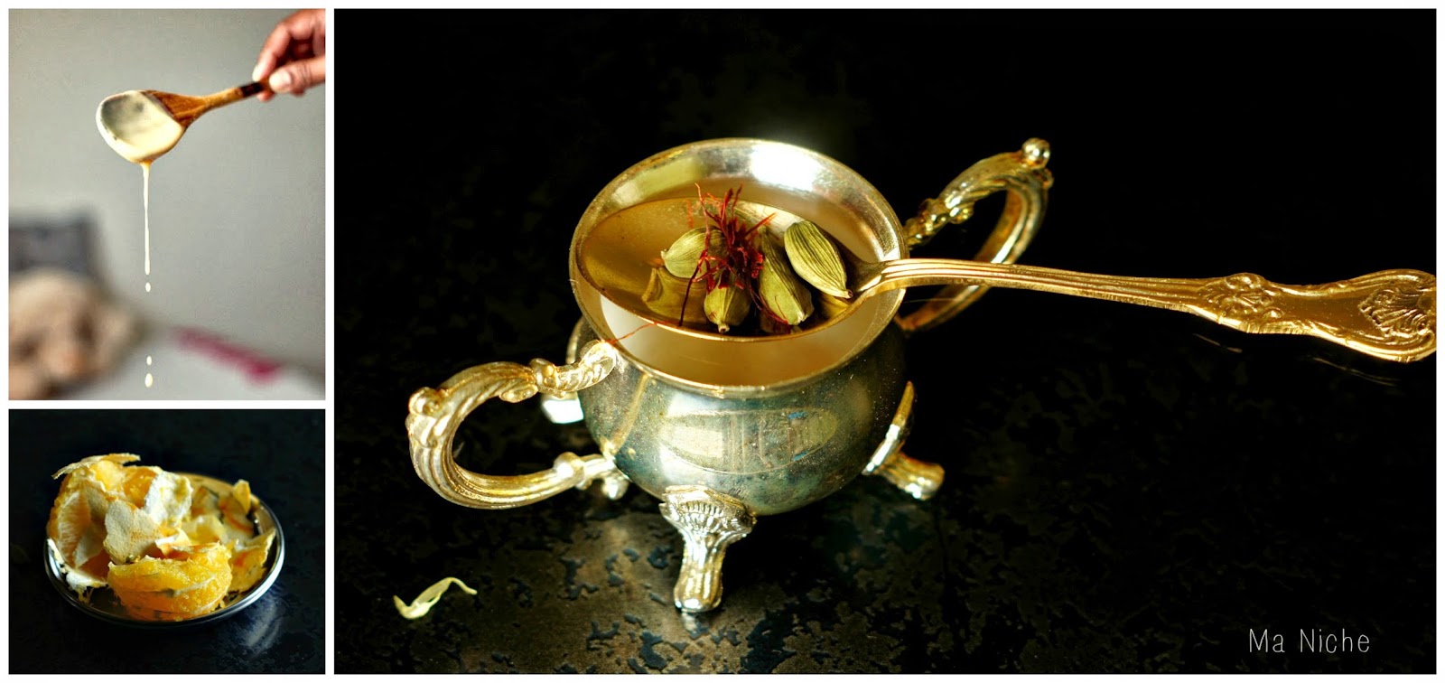 Oranges in milk pudding flavored with green cardamom and saffronCook time: 45 minutes Total time: 45 minutes + chilling time